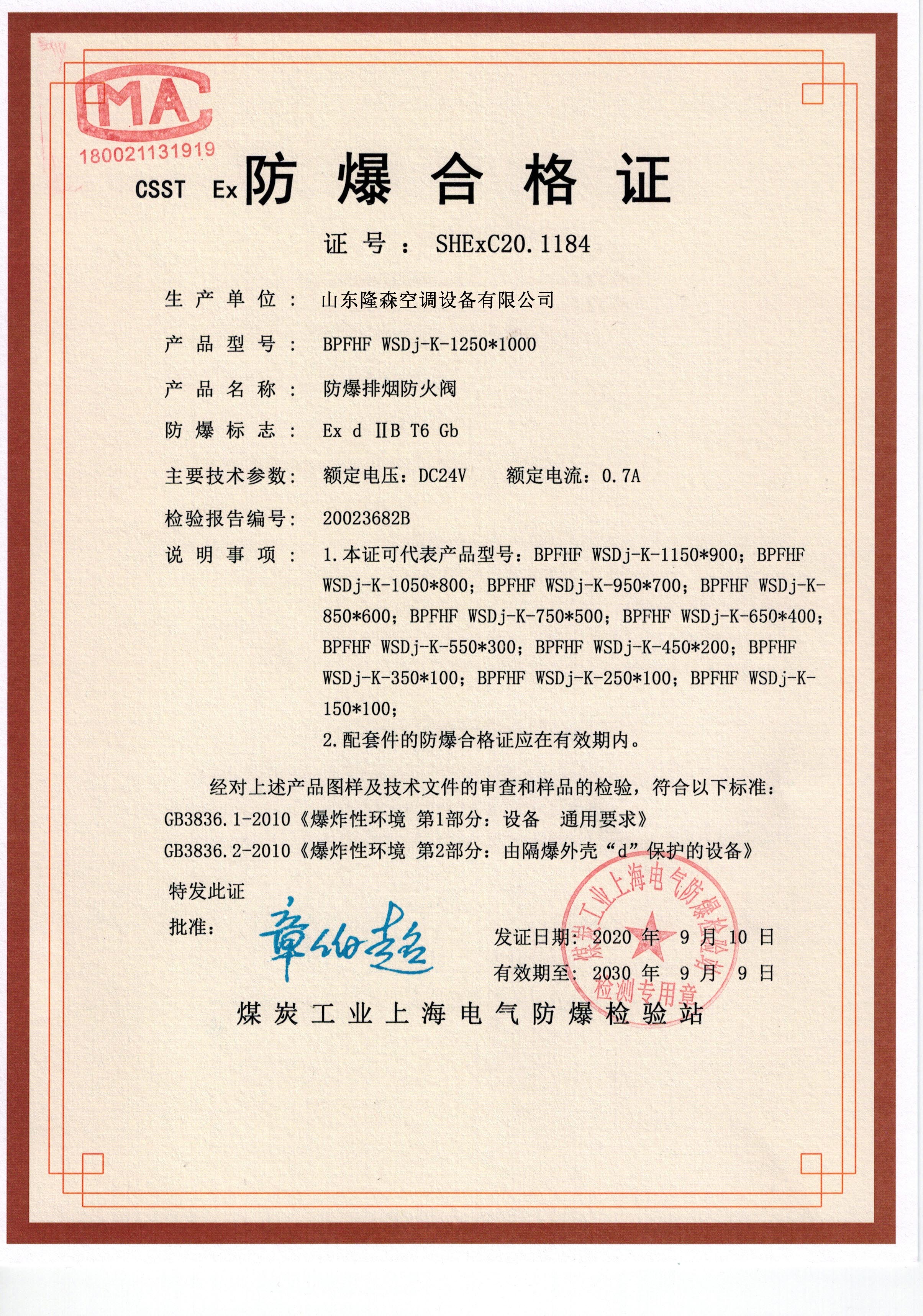 • 防爆排煙防火閥合格證